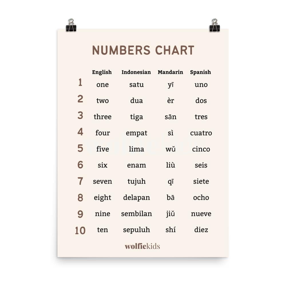 Level up counting up to ten with Wolfie's counting chart. Featuring English, Indonesian, Mandarin and English translations of numbers to teach your kids a basic math skill and a foundation to other languages as well.