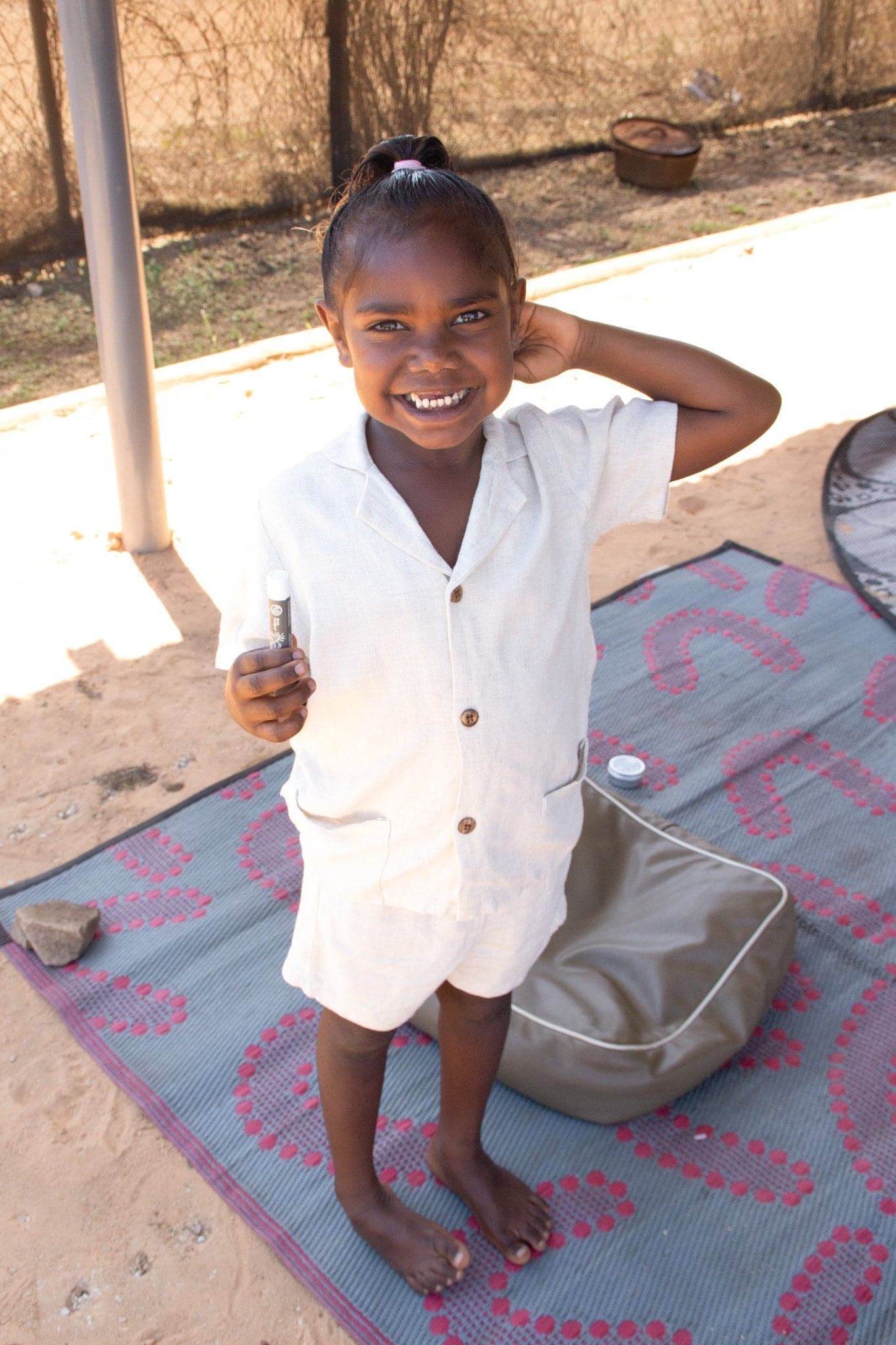 The Rekania set was apart of our latest brand collaboration with Bush Medijina, a group of Warningakalina women based in the remote Groote Eylandt of Northern Territory, Australia - Rekania is the name of this sweet girl modelling & her sister is Shekania.