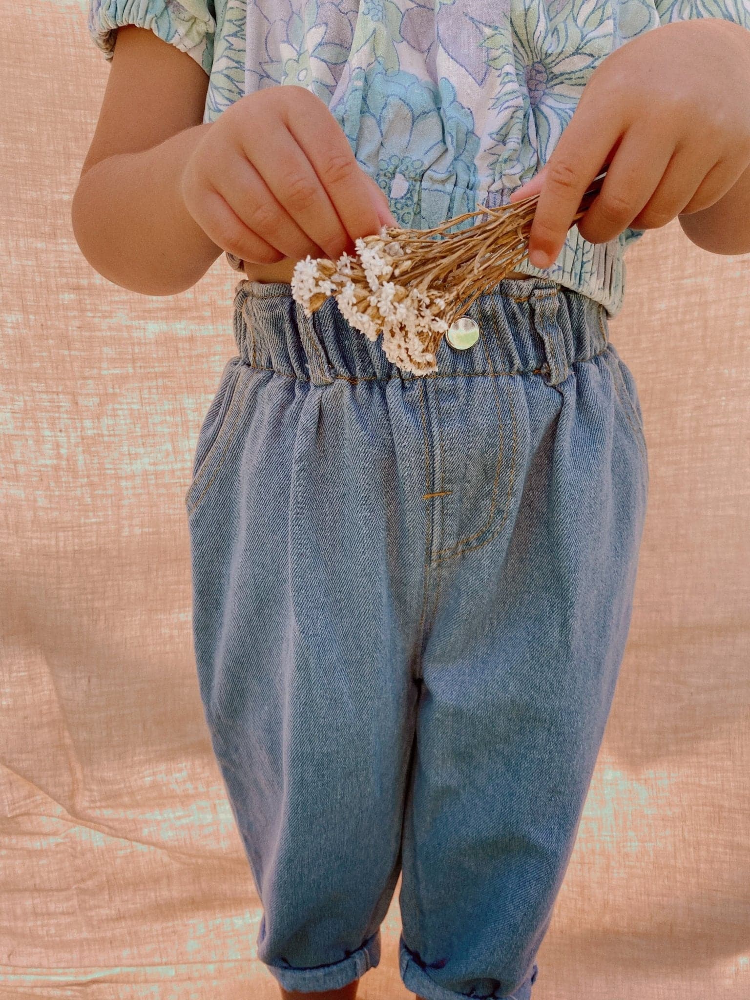 Comfort meets cool with Wolfie's newest versatile piece Jaka jean. This light-washed jeans with loose and relaxed fit can be easily paired with any top and outerwear for a leveled up look. The X pants is a pull-on bottom making it easy and stress-free during dress up time with your little one.